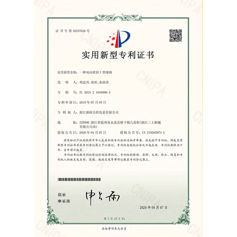 一種雙向密封V型球閥 專利證書